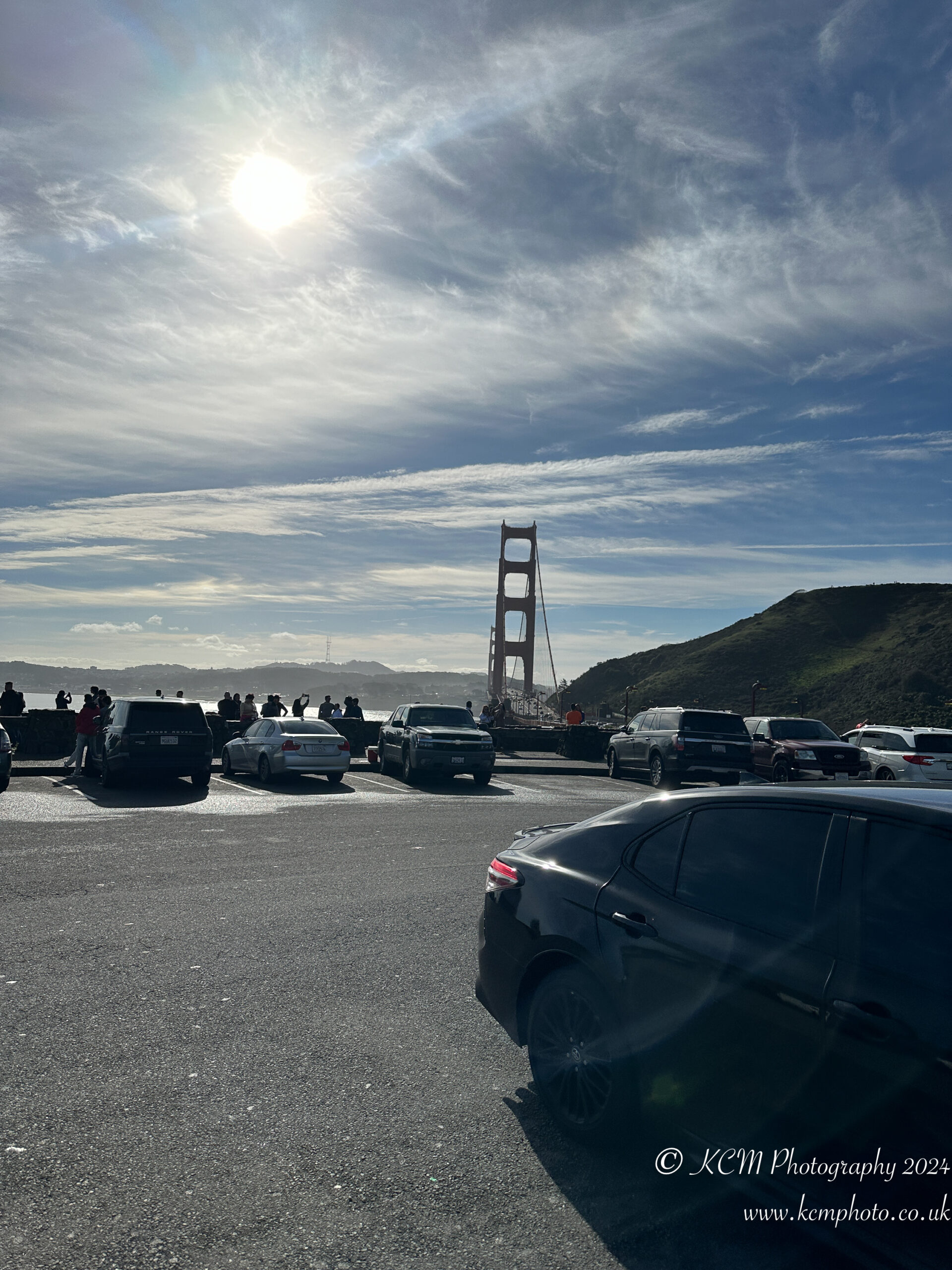 a parking lot with cars and a bridge in the background
