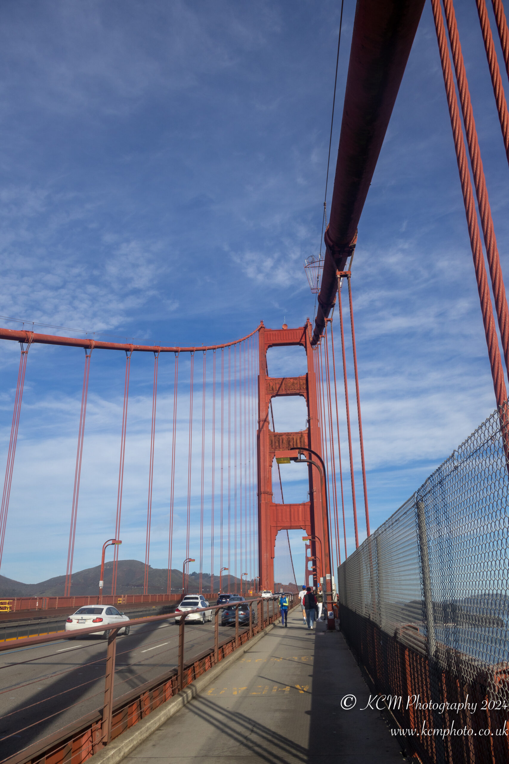 a red bridge with cars and people walking on it